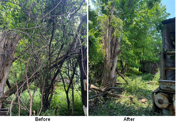 Photo 7. Before and after images showing the removal of buckthorn and vine overgrowth along a young native forest edge bordering a cultivated field.