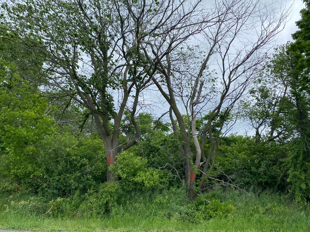 Dozens of dead ash trees were marked for removal, prioritizing those posing overhead hazards or obstructing regeneration along key corridors. In several hedgerows, ash mortality had already triggered canopy gaps, exposed the soil surface, and accelerated the spread of sun-seeking invasive species. The bare crowns of dead ash are visible in Photo 2, where wind and light exposure are increasing soil warming and reducing moisture retention.