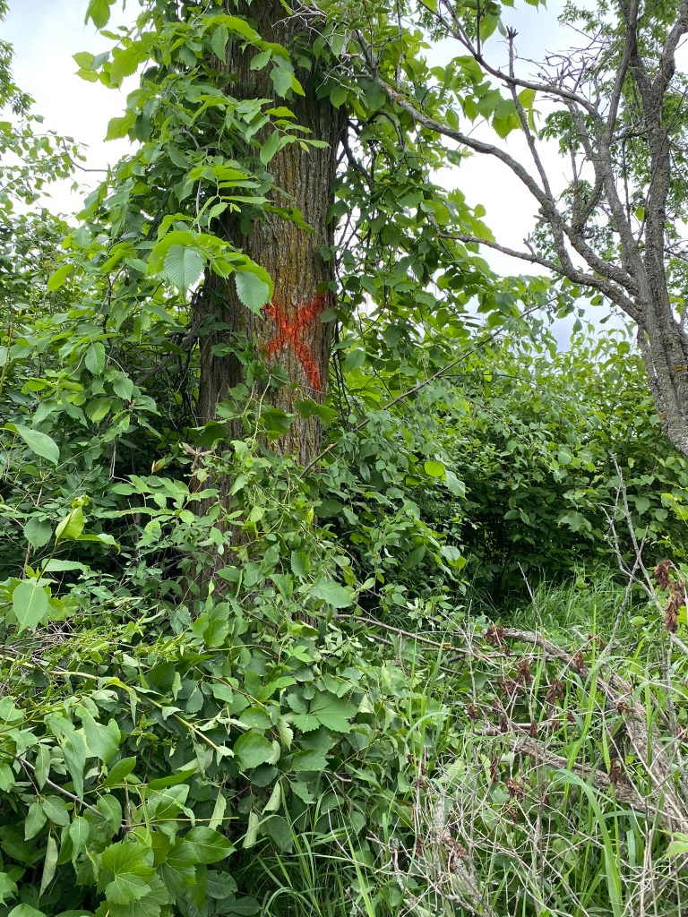 Photo 3. Marked dead ash overtaken by vine growth. With canopy loss from emerald ash borer, invasives like parsnip, garlic mustard, buckthorn, and dog-strangling vine spread rapidly through the exposed understory.