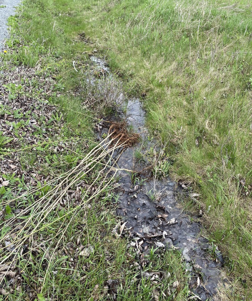Photo 6. Dormant willow whips staged in a flooded ditch ahead of planting. These moisture-tolerant stems will help stabilize berms and restore structure along a fragmented hedgerow.